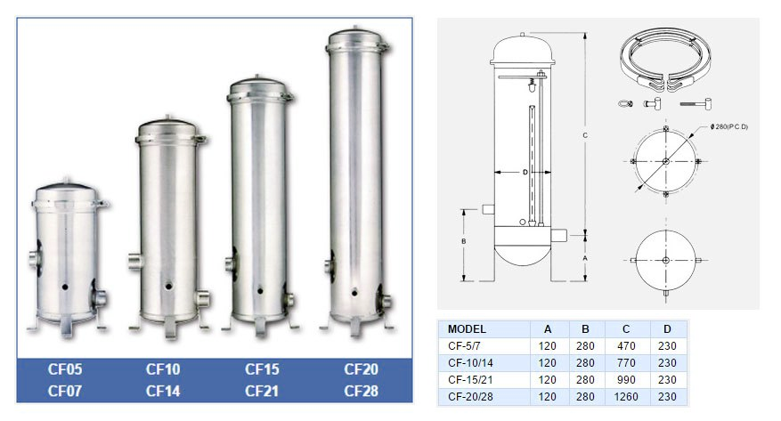 Корпус фильтра AquaPro CF20 предназначен для высокопроизводительной тонкой очистки воды и химических растворов от механических примесей. Обеспечивает эффективную фильтрацию производительностью до 20 м³/ч через 5 сменных картриджей увеличенной высоты 40″. Совместим с фильтрующими элементами из полипропилена, полиэстера и активированного угля.